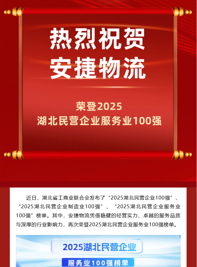喜报|热烈祝贺安捷物流再次荣登2025湖北民营企业服务业100强榜单!